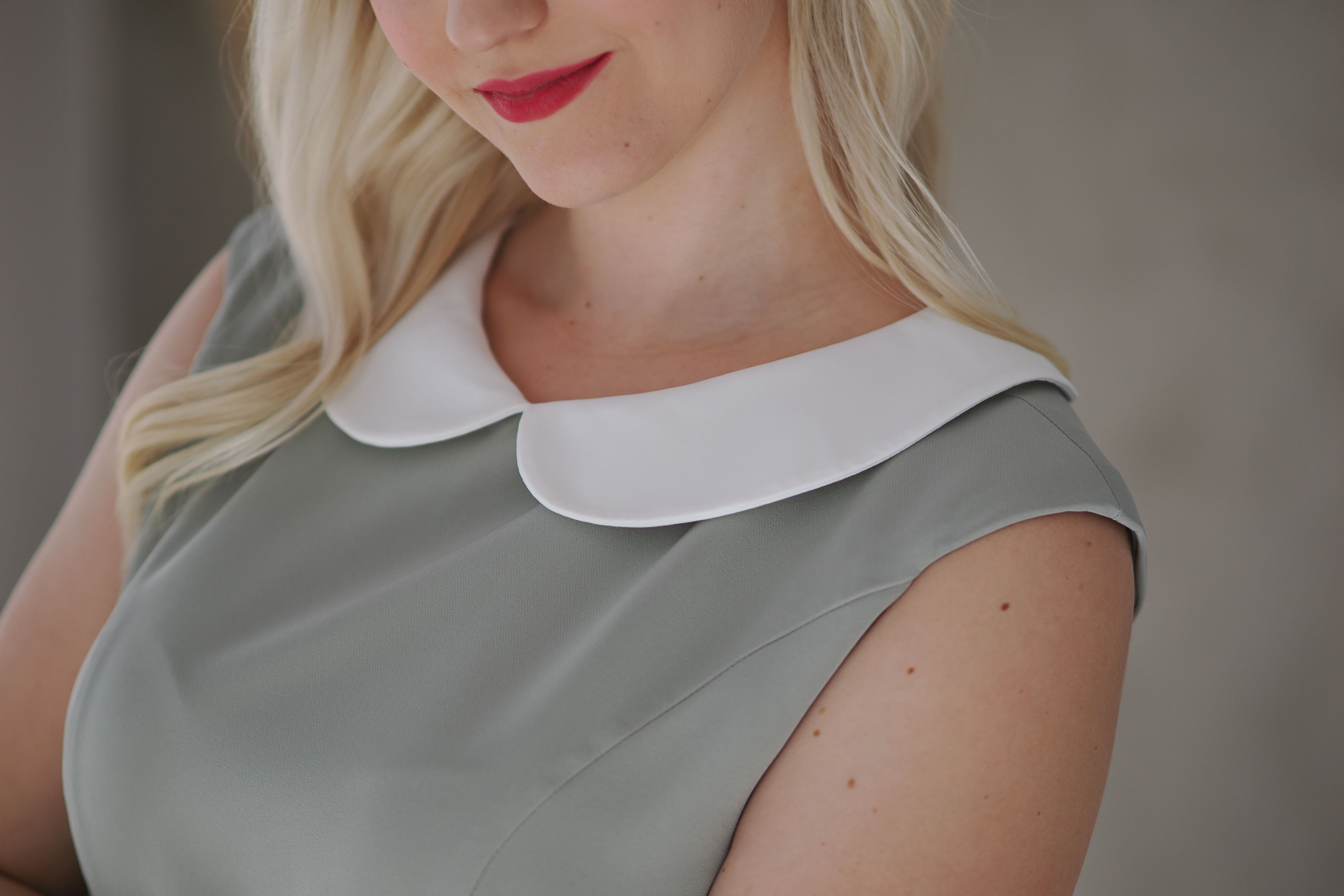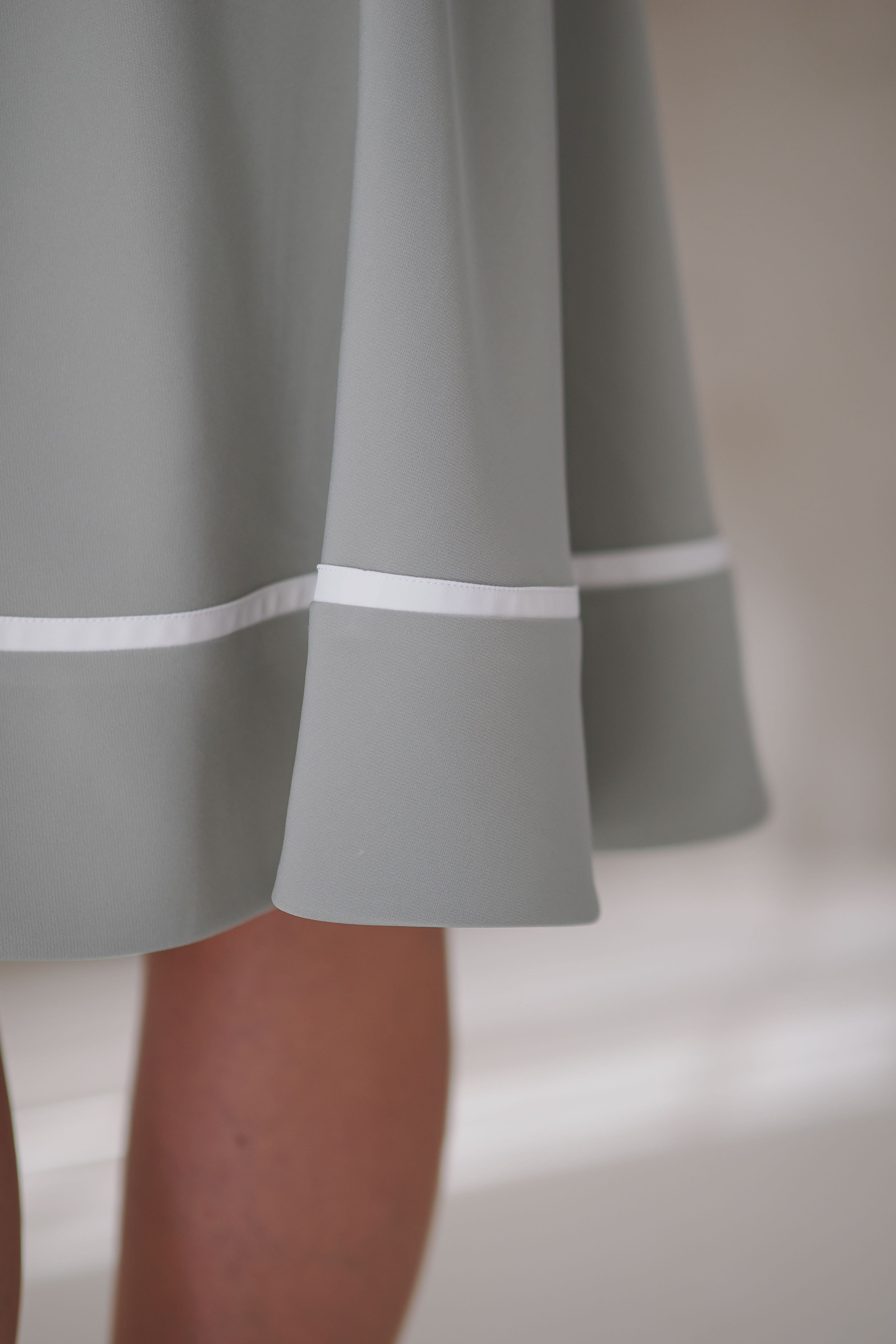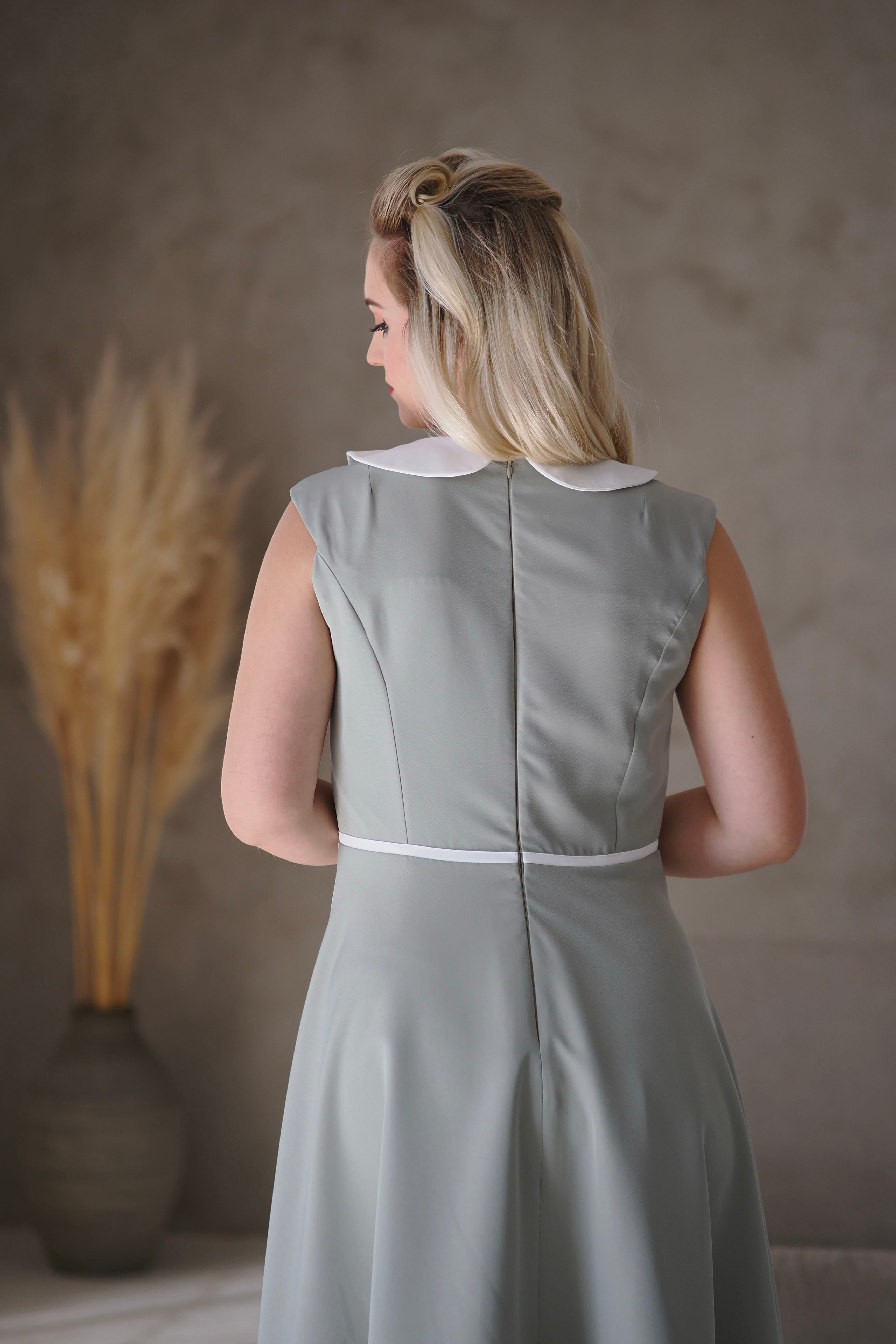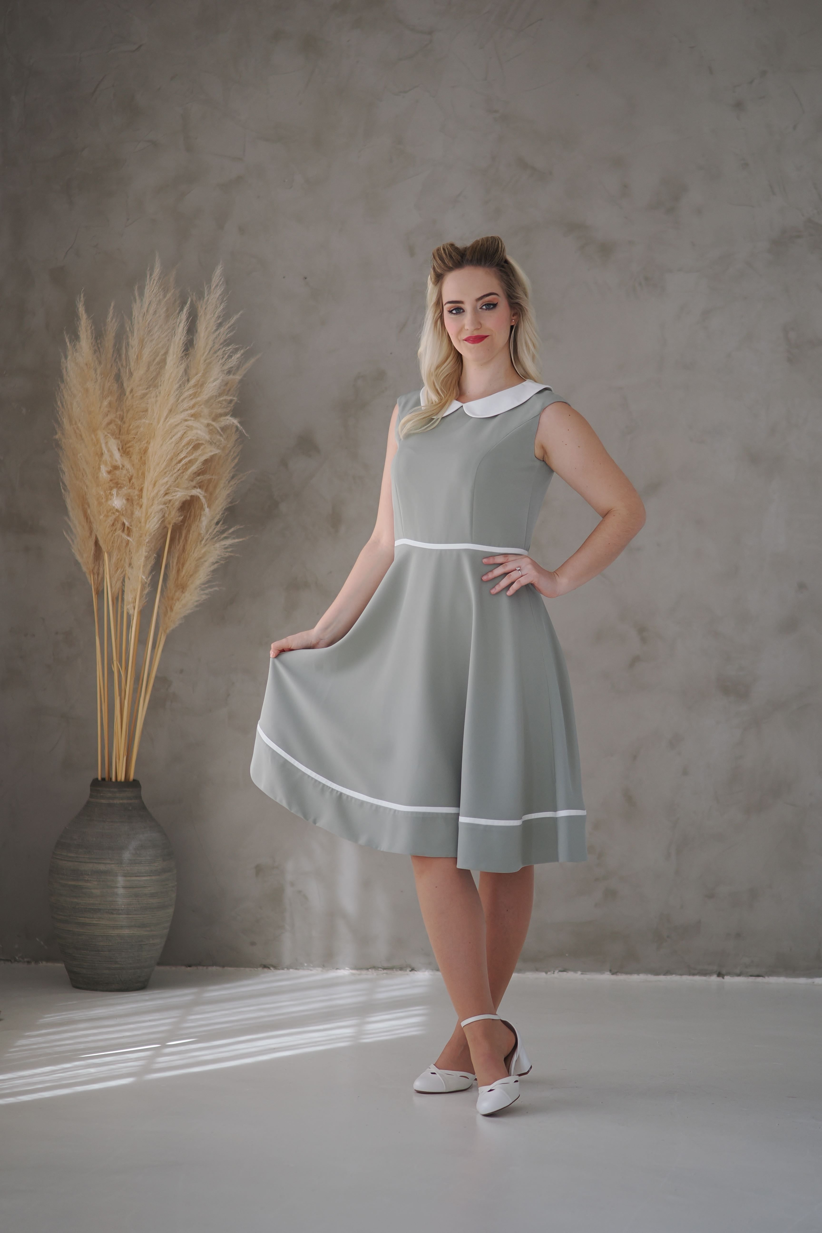 Our dress, featuring an easy and elegant look that highlights the body's lines, gets a playful appearance from the contrasting bubble collar and white stripes. The sleeveless design offers a particularly feminine, unique, and refined look.