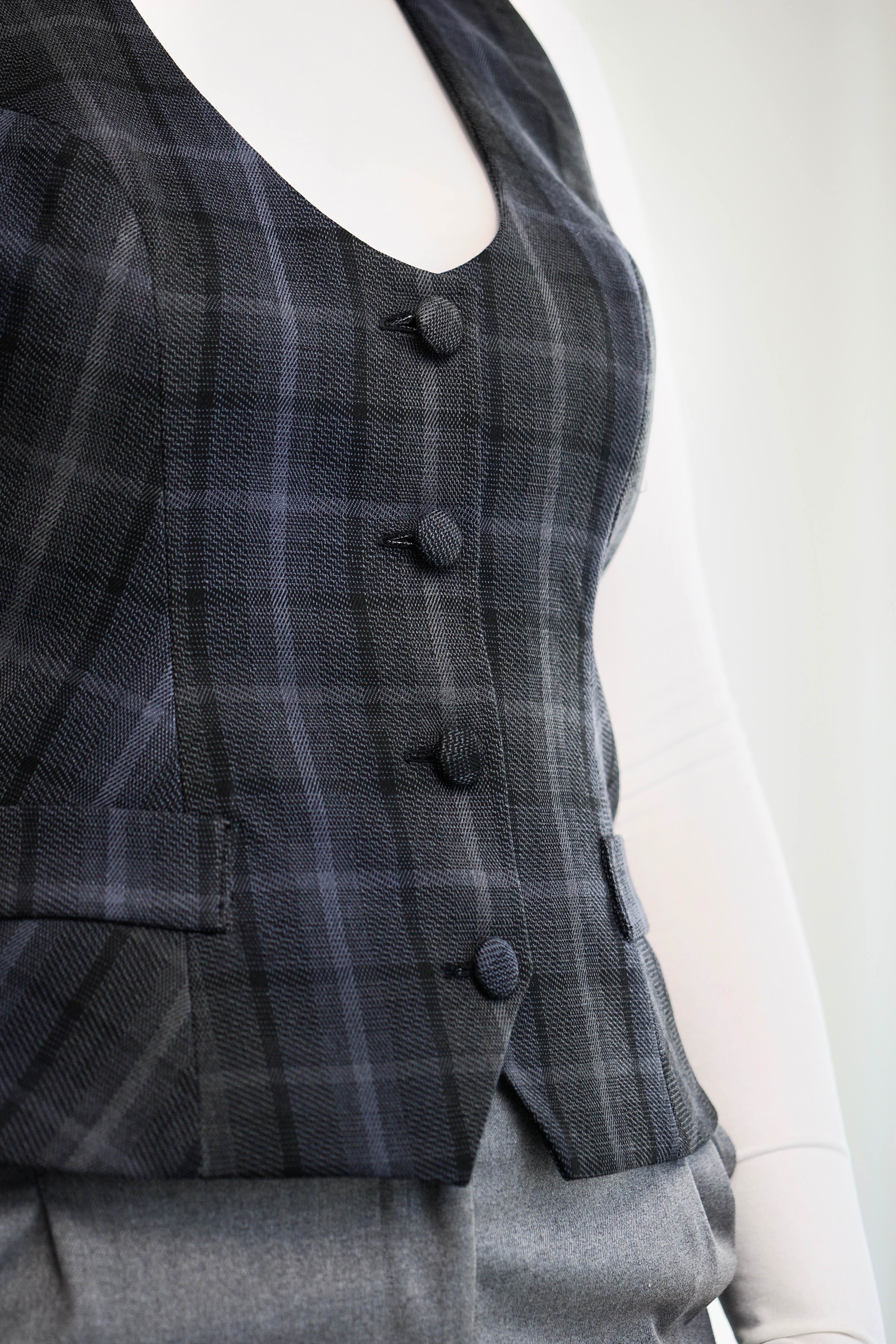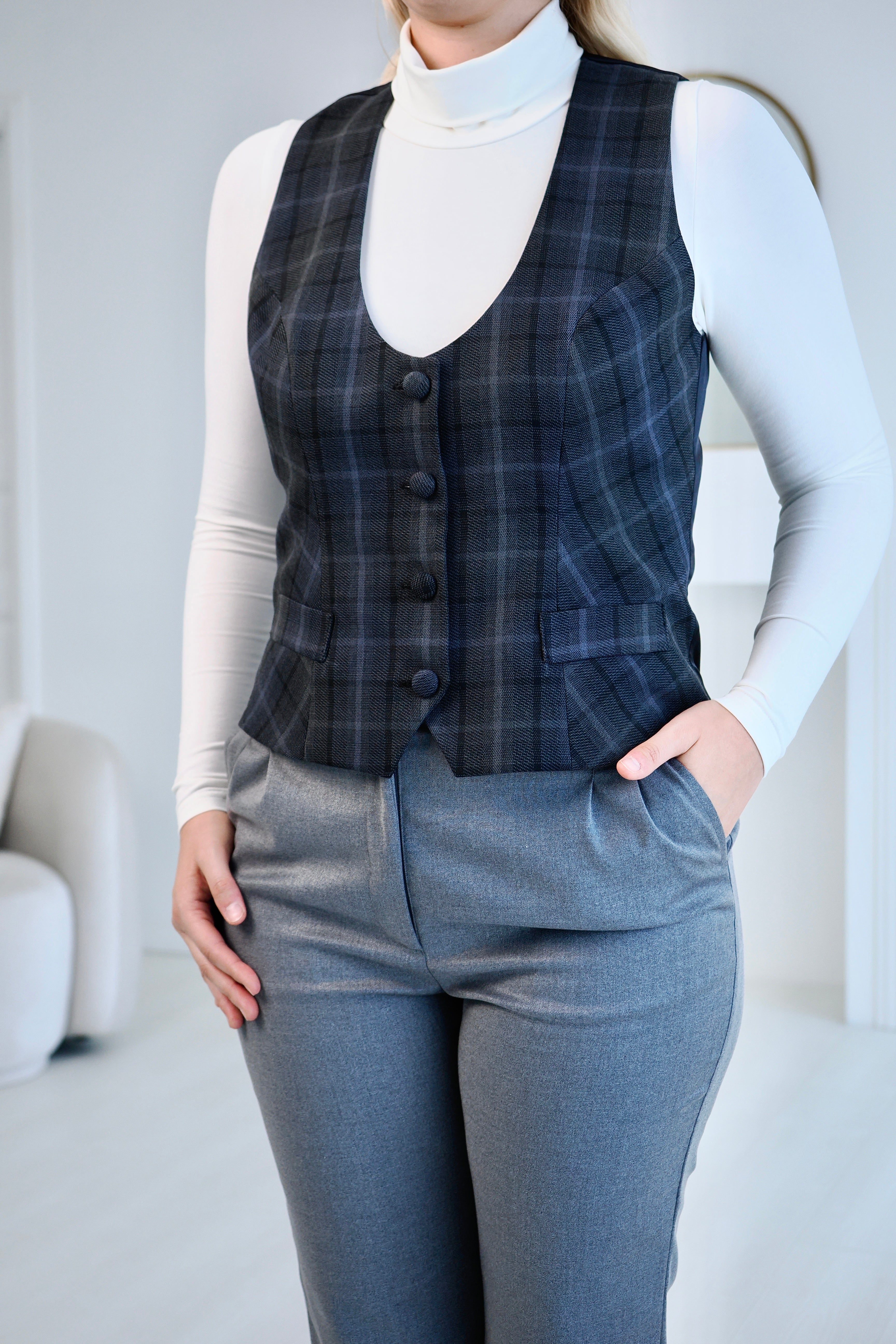 Classic checked vest with an elegant look. The front is form-fitting, while the back has a strap for waist adjustment. Material composition: 60% pes, 35% viscose, 5 sp