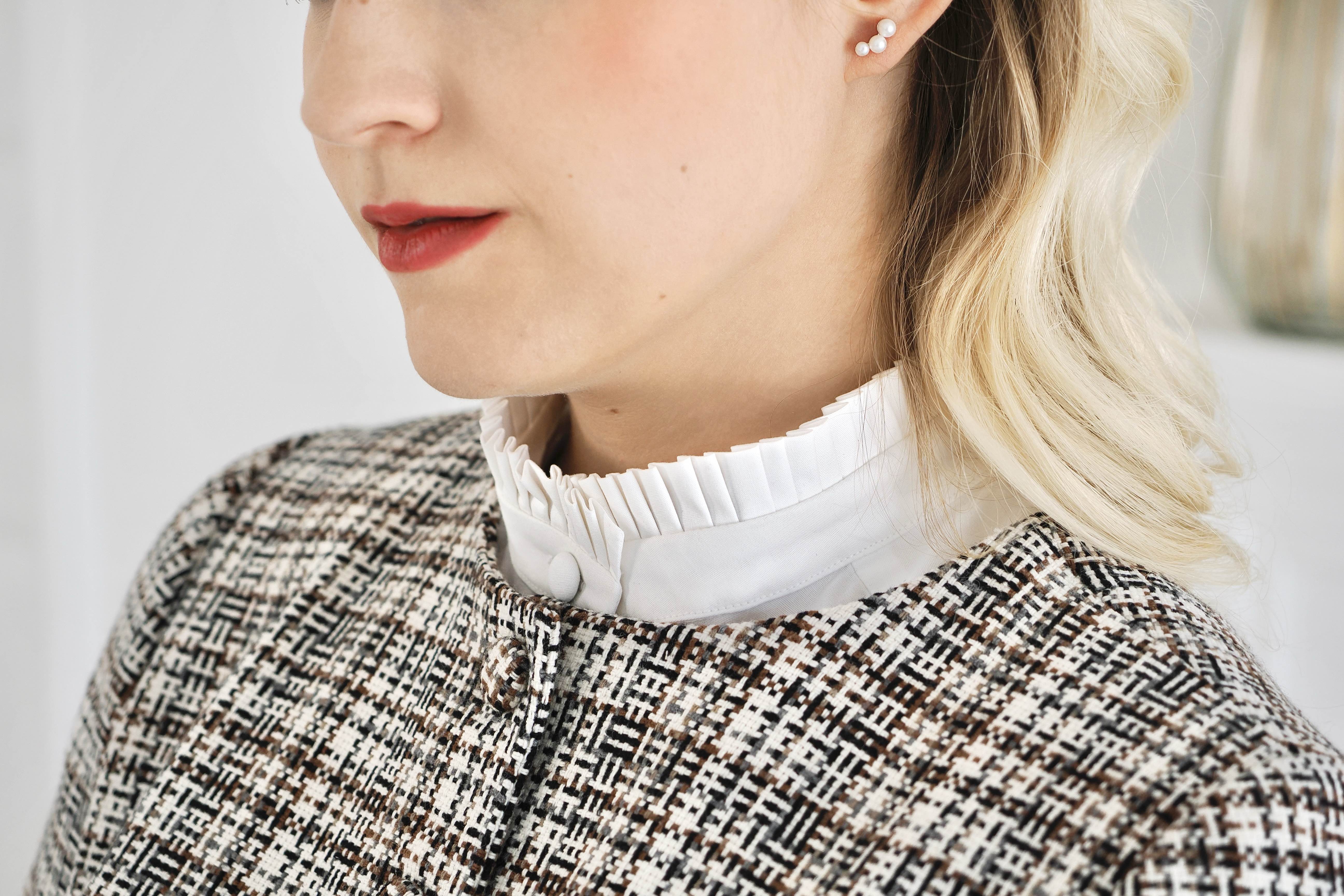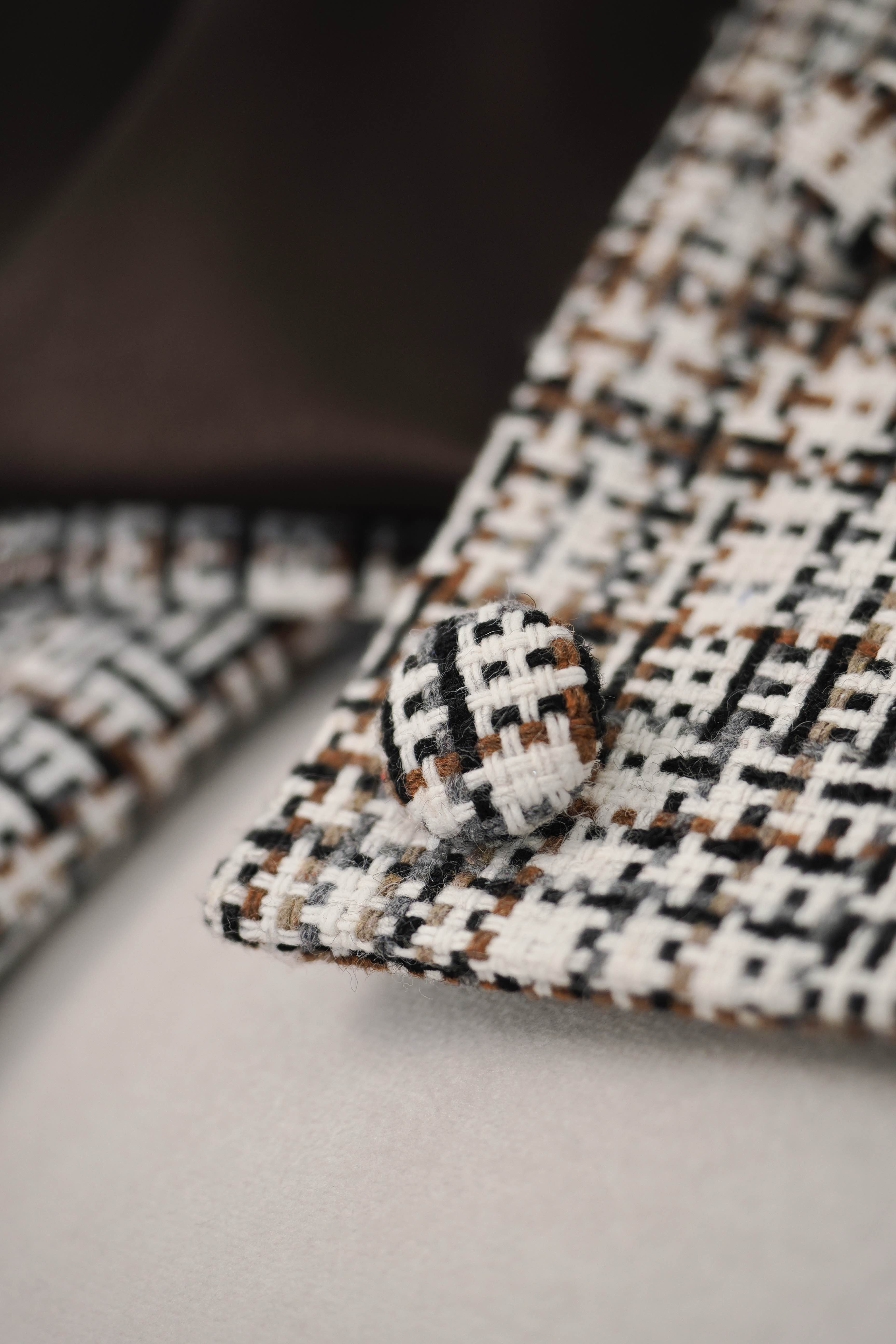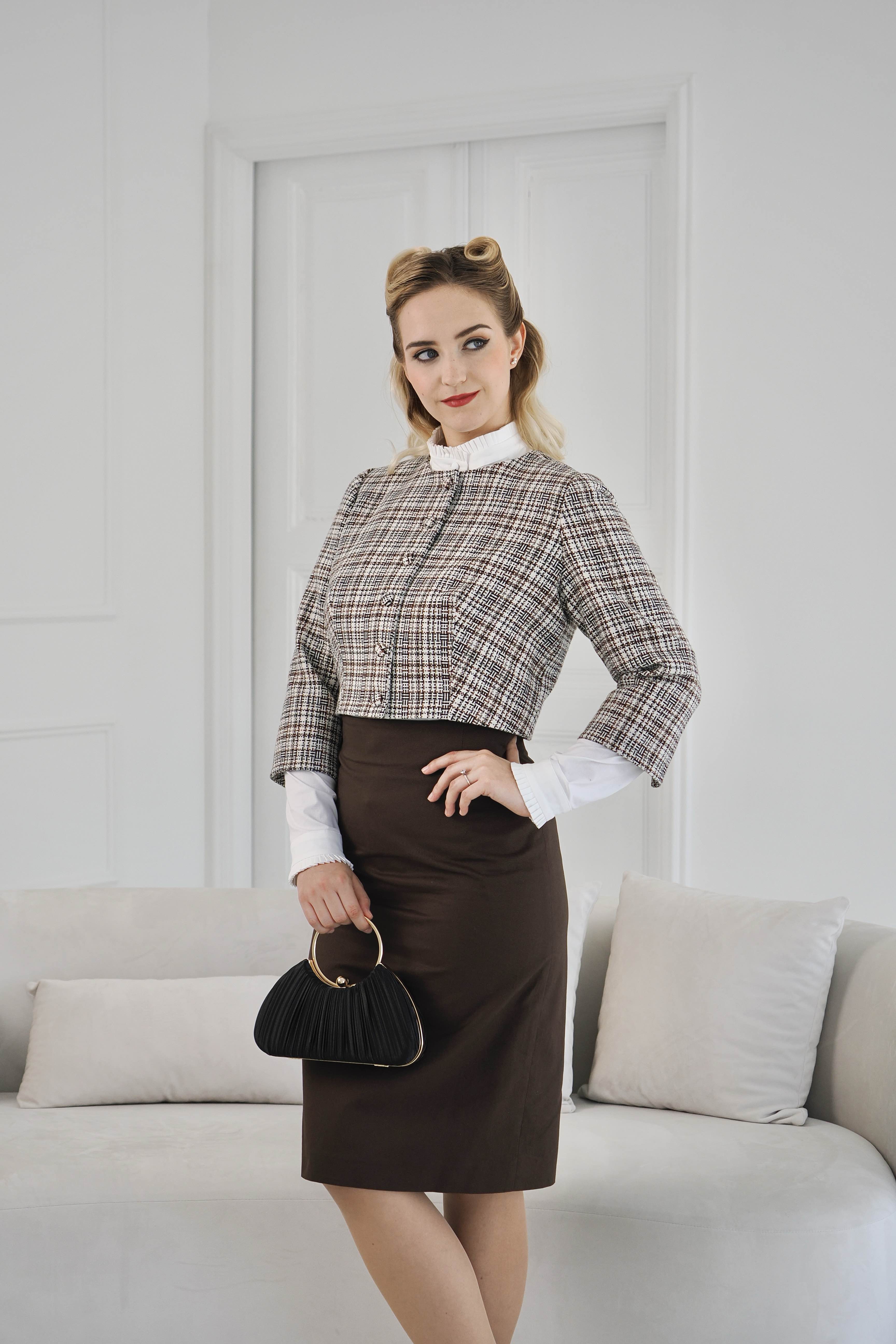 This jacket is short, waist-length and fastens with self-fabric buttons. Its slim lines accentuate the shape, while the 3/4 sleeves with slits exude elegance. The cuffs can be rolled up by 4-5 cm, offering a variety of styling options. The meticulous workmanship of the lining ensures comfort and quality. Material composition: 79% viscose, 16% polyester, 5% sp