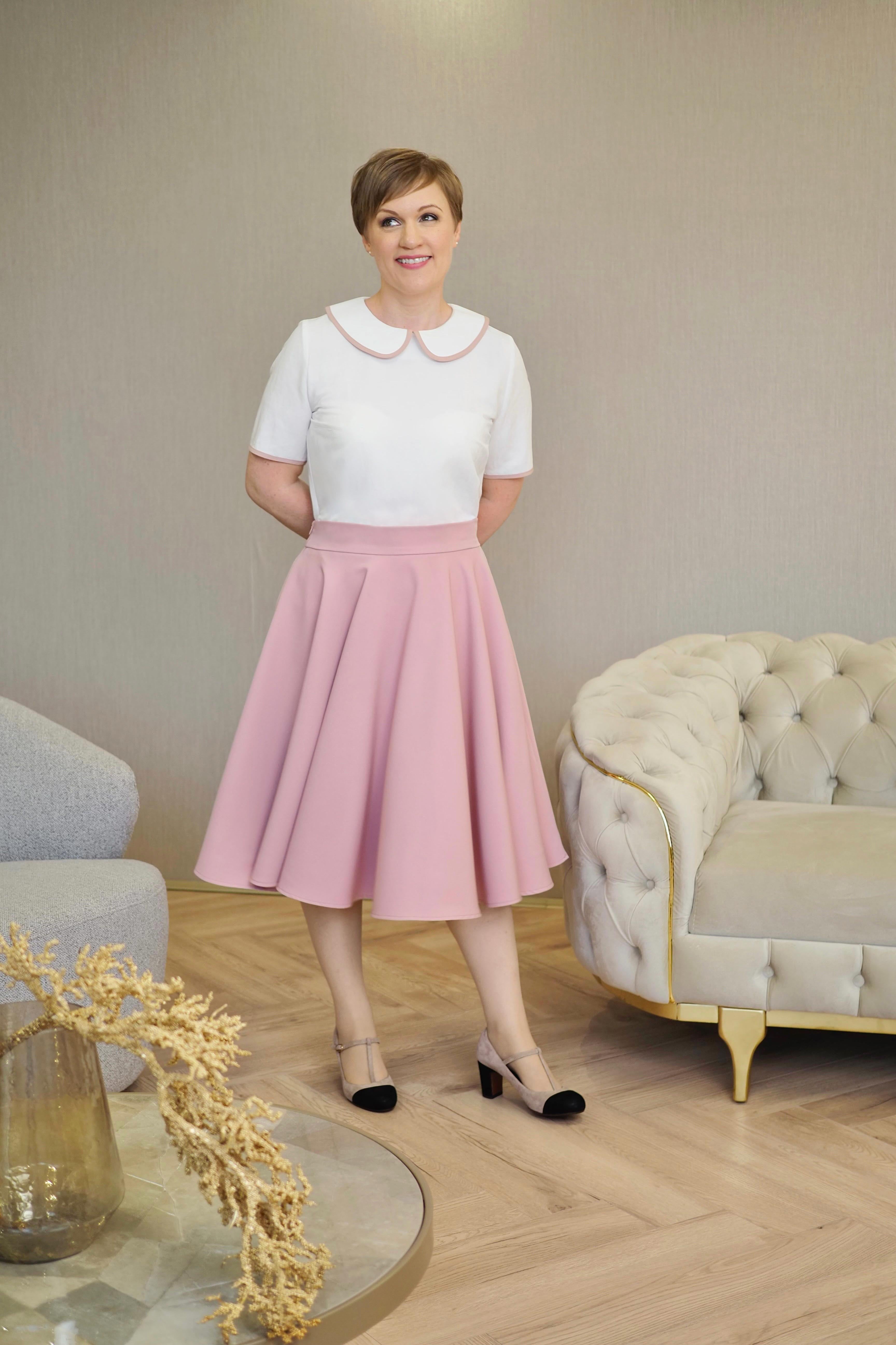 A circle-shaped skirt with a hidden zipper on the side and beautiful curls.Material composition: 93% polyester, 7% elastane.