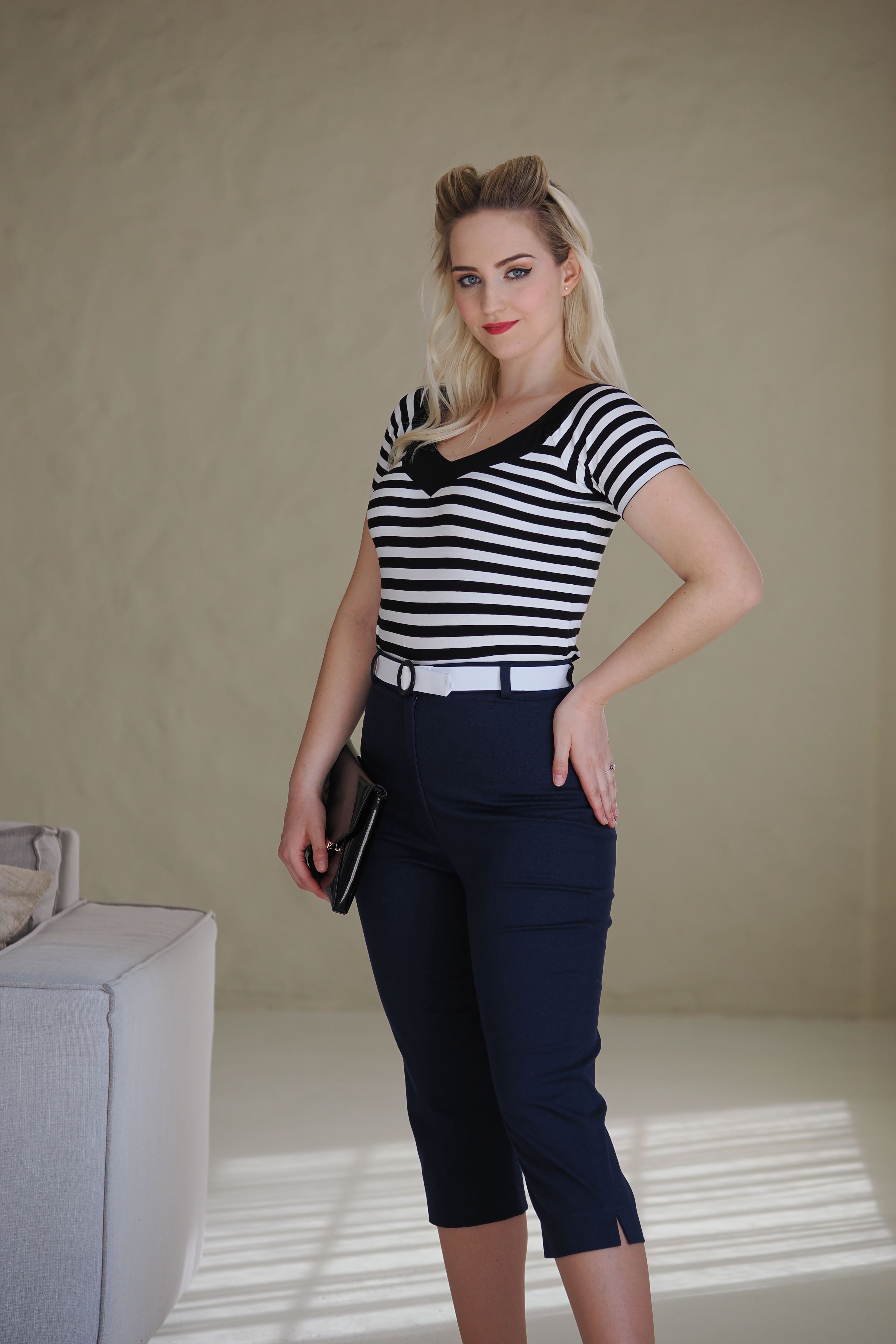 These 3/4-length, body-hugging, slim-fit, stretchy cotton capri pants perfectly accentuate the line of the legs while providing an elegant look with their small slits. Thanks to the classic navy blue color, they can be easily paired with various tops and accessories, allowing for versatile style choices. The belt is not included with the pants, giving you the opportunity to choose one that matches your own taste.