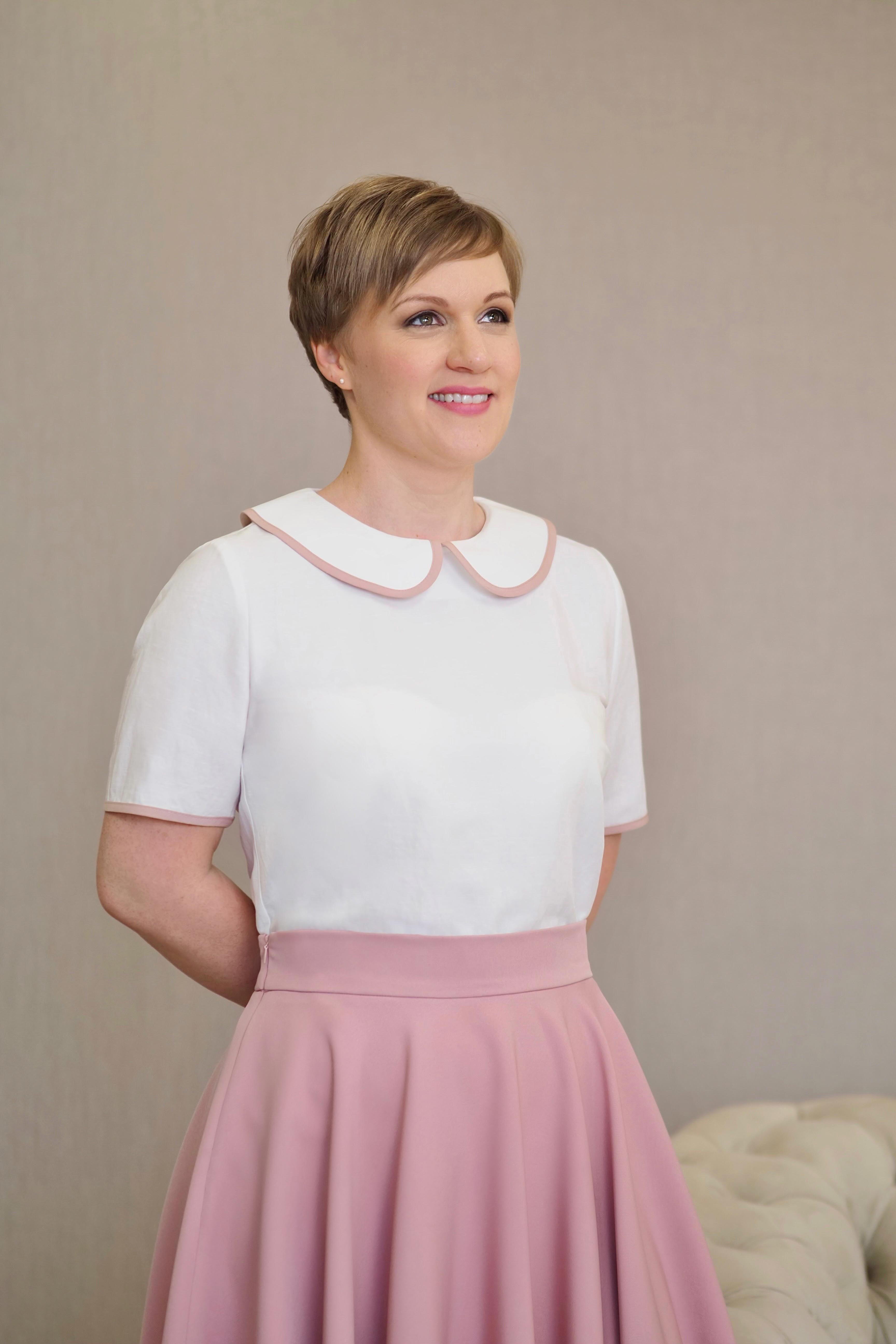 Short-sleeved blouse made of linen canvas, featuring a contrasting collar and sleeve ends, with a hidden zipper at the back. It's not fitted, rather a more relaxed style.